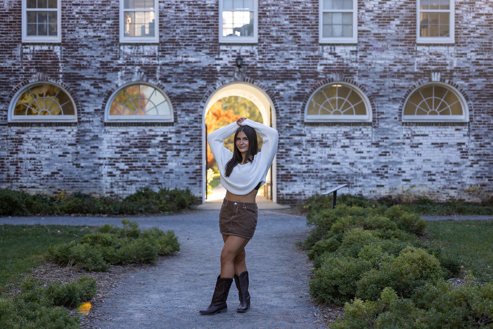 I grabbed my handy pop-up changer so that she could put on her first dress – a super cute red number that was sure to pop in photos. We focused on the tree-covered lane first. The leaves had mostly fallen but a few had hung on just for us. We had so much fun with posing and making sure Rebel was looking super handsome!
