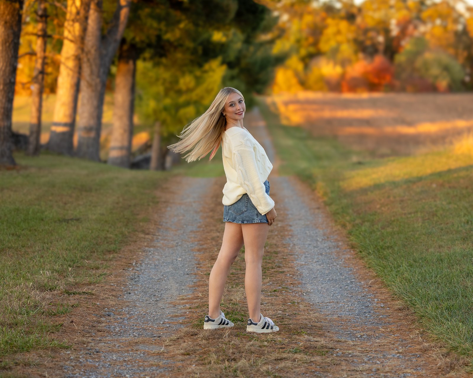 I also use the roads, stone walls, fences, and all the little details around the property. Since I’m there often, I’m always finding new spots and angles so every senior gets a mix of familiar favorites and something that feels unique to them.