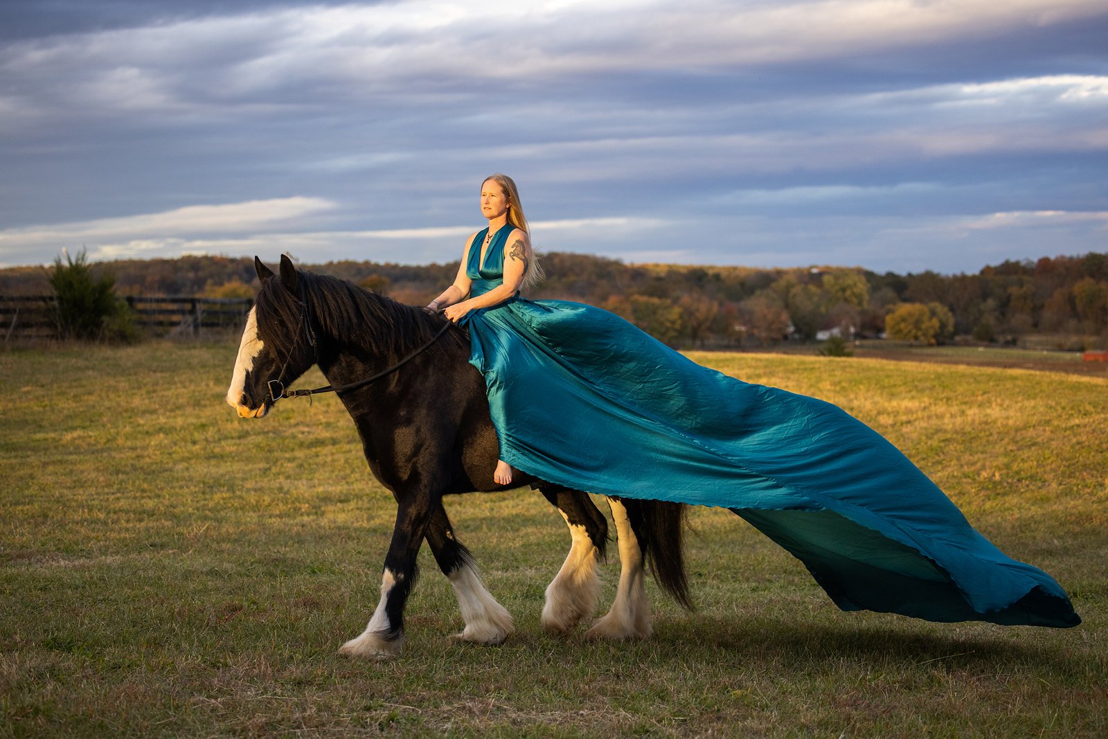We had another dress change to this incredible, sophisticated dress. Wowzers! She looked amazing. We had a brief moment of crazy wind but then it settled down and the sky decided to come out to play. We went over to this large, open field where she could let Rebel run free. This is when we broke out my flying dress. The teal color looked amazing on S and the portraits look exactly like the inspiration images. I felt so giddy!